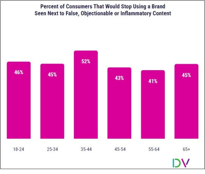 The survey also gives content publishers fresh reasons to embrace brand safety tools. Not for the ad buyer’s sake, but for the consumer’s. In North America, DV says 45% of consumers said they were likely to stop using a brand or product if an ad is displayed alongside false, objectionable or inflammatory content. And 43% of consumers said they would advise their family and friends to stop using that product as well. The data shows the backlash to objectionable content is even more pronounced in urban areas, where nearly half of consumers are likely to discontinue use. And it says men were also more likely than women to respond to objectionable content, as are consumers under age 45.
