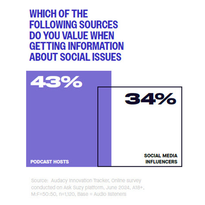 Audacy says podcasts have become the “heartbeat of the creator economy,” powered by hosts whose authenticity drives listener trust. Nearly six in ten podcast fans say they trust ads more when read by the host, and 95% report taking some form of action after hearing a podcast ad—whether recommending a product, seeking more information, or making a purchase.