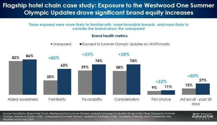 Add to the above two case studies conducted by Westwood One, where two hotel chains saw brand equity boosts among listeners exposed to ads during Westwood One’s Summer Olympics updates or its NCAA college football coverage. In the former case, a flagship chain saw ad recall and familiarity up 80%, while in the latter, listeners exposed to a mid-range hotel chain’s spots had a 50% greater familiarity with the brand, a 32% increase in brand familiarity, and a 34% growth in brand consideration.